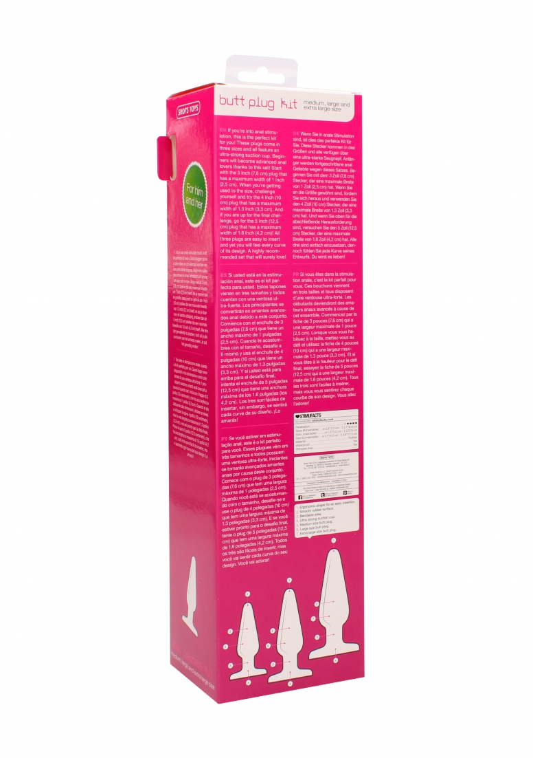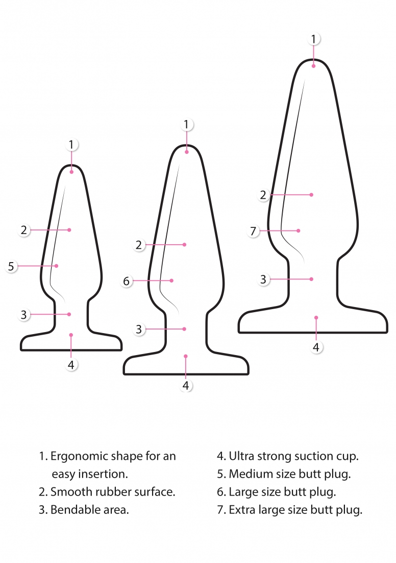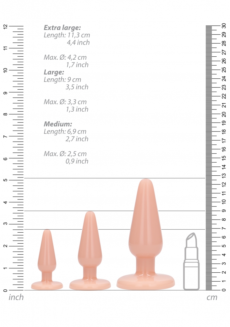 Specifications:- 3 sizes: M – L – XL- Medium: diameter 2,5 cm, insertable length 6,5 cm- Large: diameter: 3,3 cm, insertable length 9 cm- Extra Large: diameter 4,2 cm, insertable length 11,5 cm