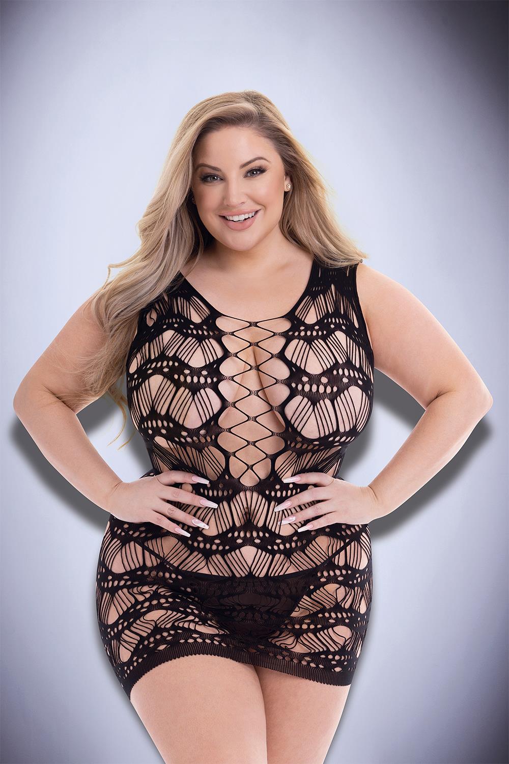 You’ll be all laced up and loving it in Baci’s newest mini dress! Available in crimson red and midnight black, this sheer lace mini features a unique and seductive pattern of laced up cutouts and wavy fishnetting. The wide, corset-laced cutouts (front and back!) and thigh-skimming length accent all of your delicious curve!