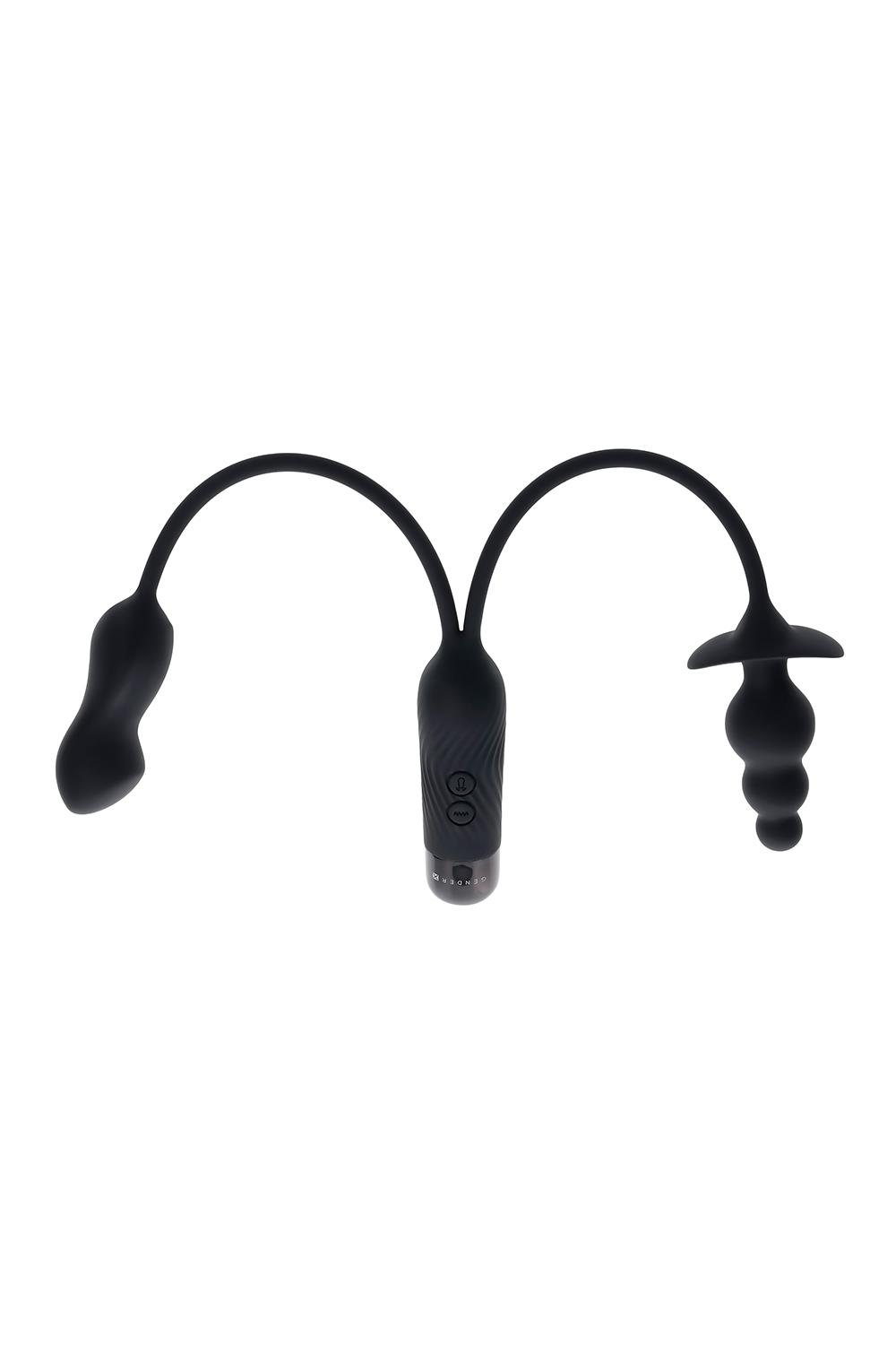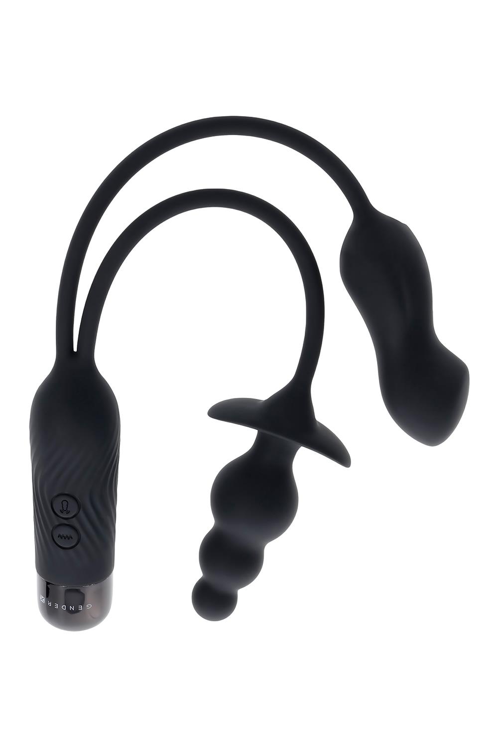 This double-motor toy features two vibrating shapes – a beaded plug and a mini-vibe each tethered by a flexible cord. The round-tip plug consists of 3 bulbs that gradually increase in size to a wide safety base. The chunky-shaped mini-vibe narrows at the center and finishes with a flattened, blunt tip. A USB plug is neatly stored under the textured handle’s screw-off cap.