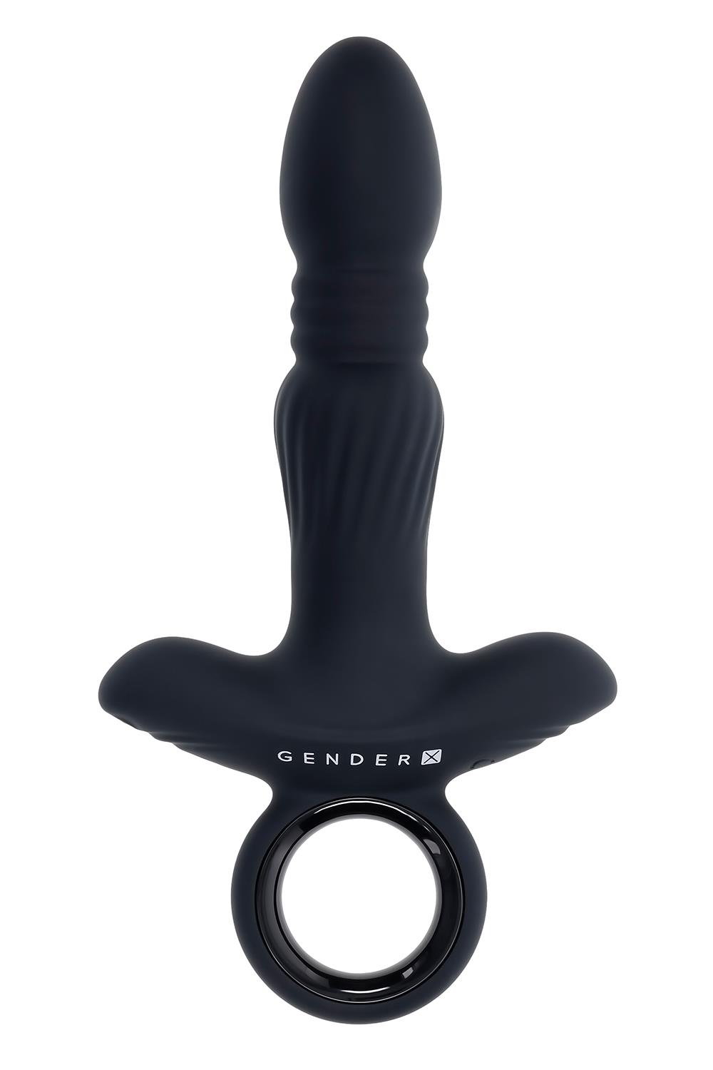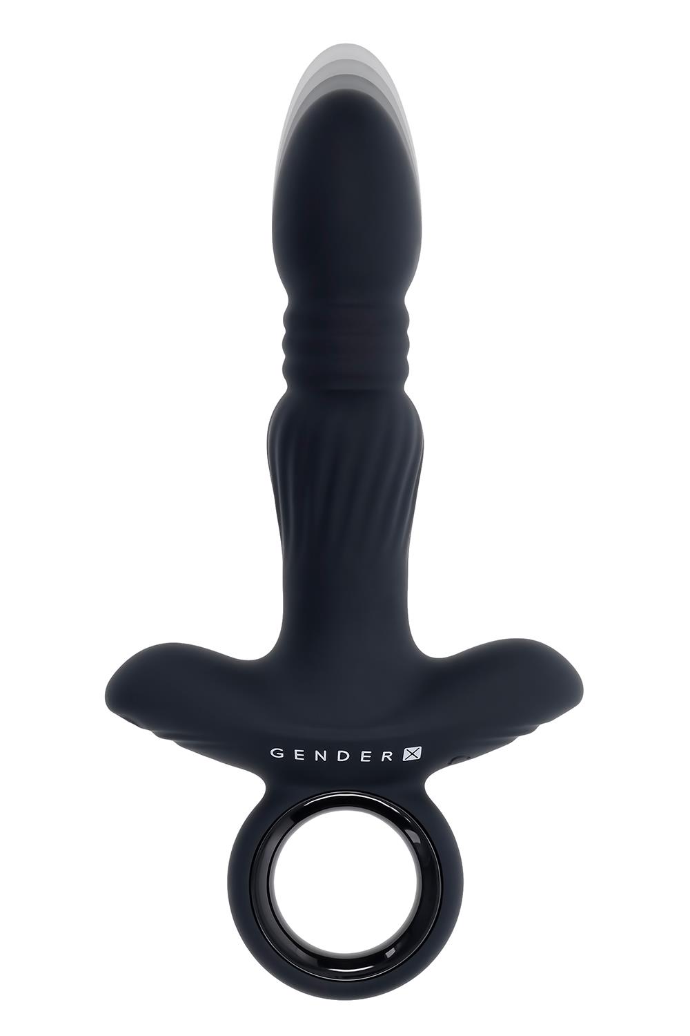 This large robust thrusting vibrator has a smooth egg-shaped tapered tip that narrows to its thrusting accordion neck before swelling out again to a textured lower shaft. The wide base and ringed finger grip make navigation handy and agile.