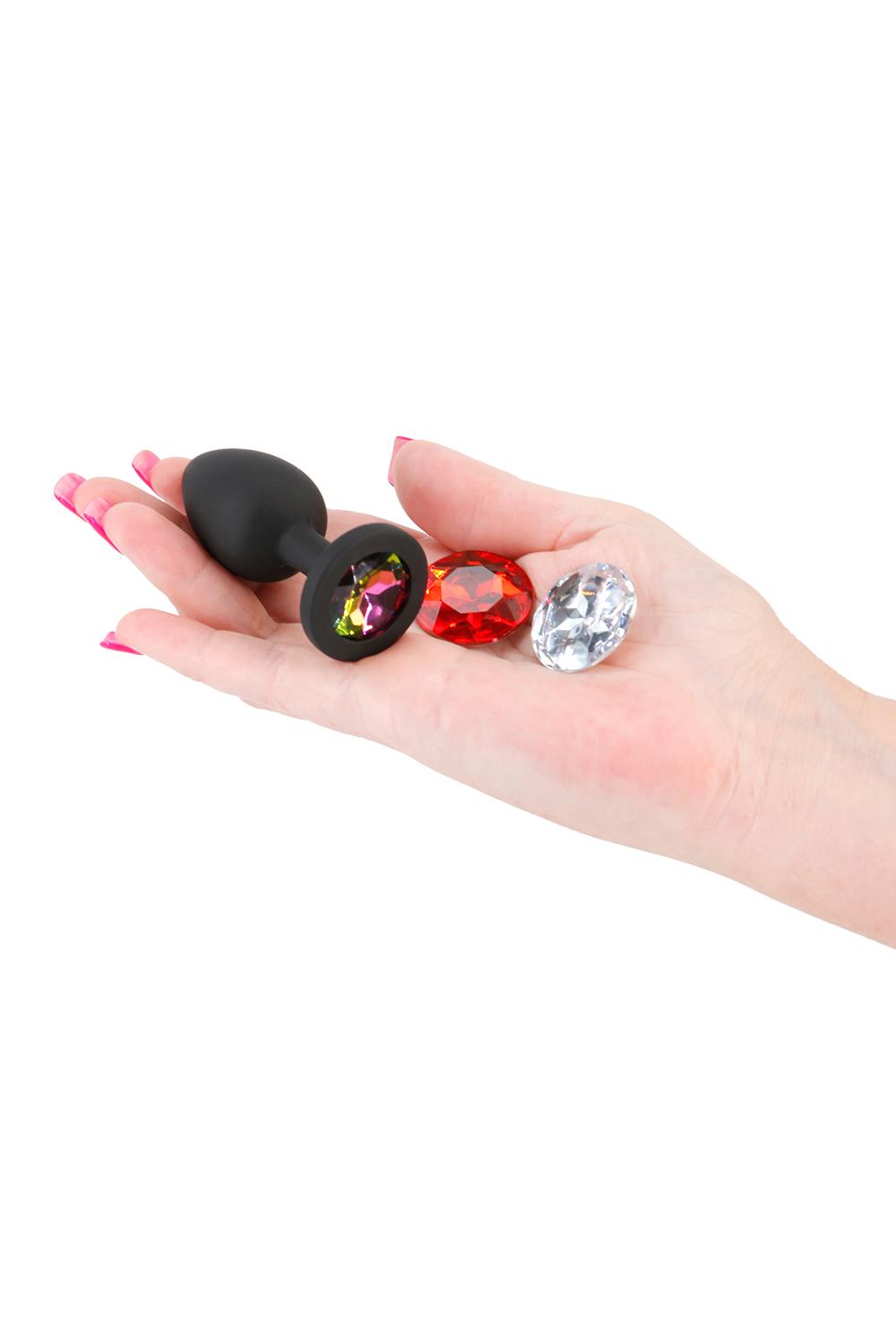 Match your mood and your booty with Glams Xchange. A fashionable accessory to entice and romance. Made from premium grade silicone featuring three interchangeable colorful gems.