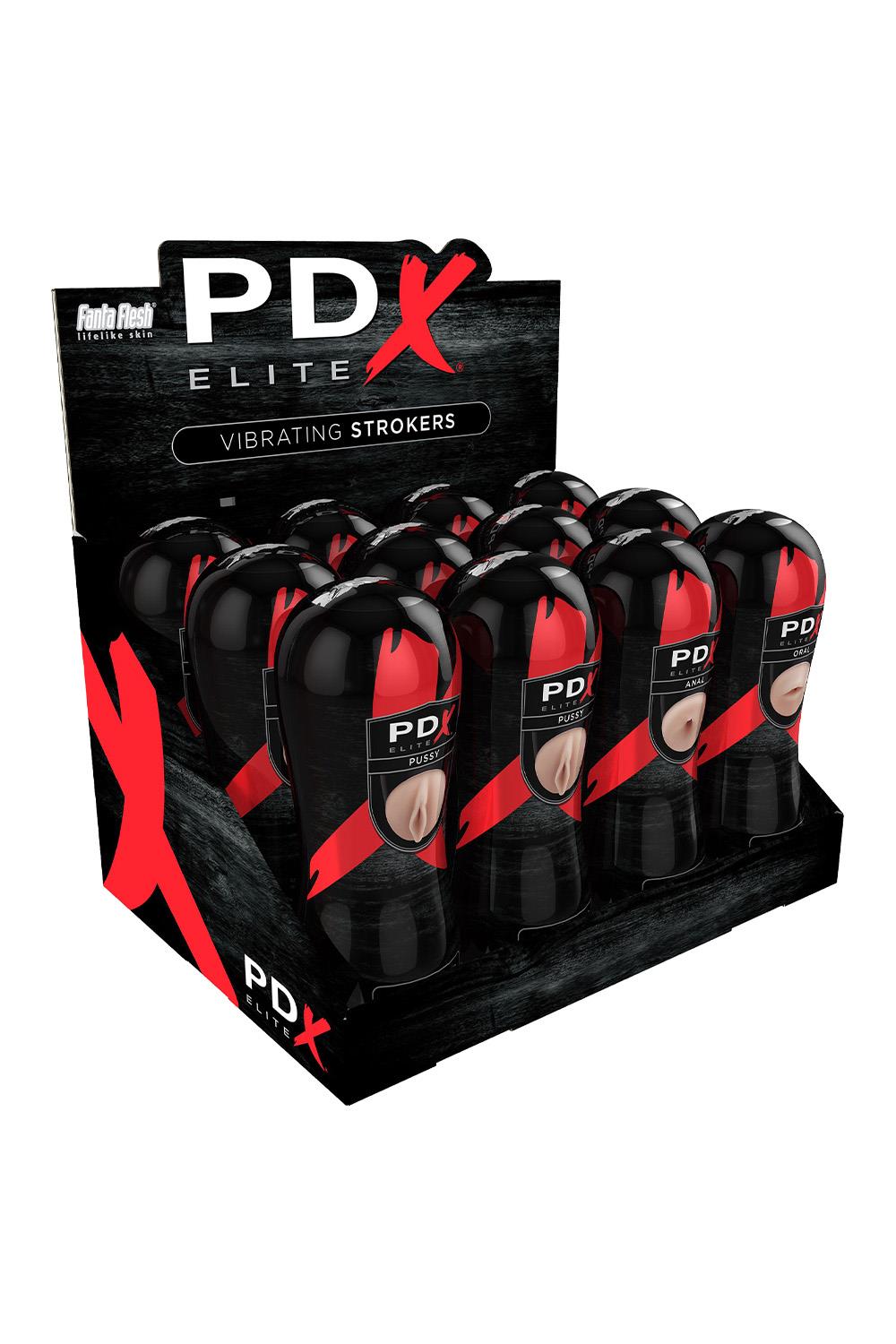 The Vibrating Stroker Display includes the Vibrating Pussy Stroker, Vibrating Anal Stroker and Vibrating Oral Stroker from PDX Elite.