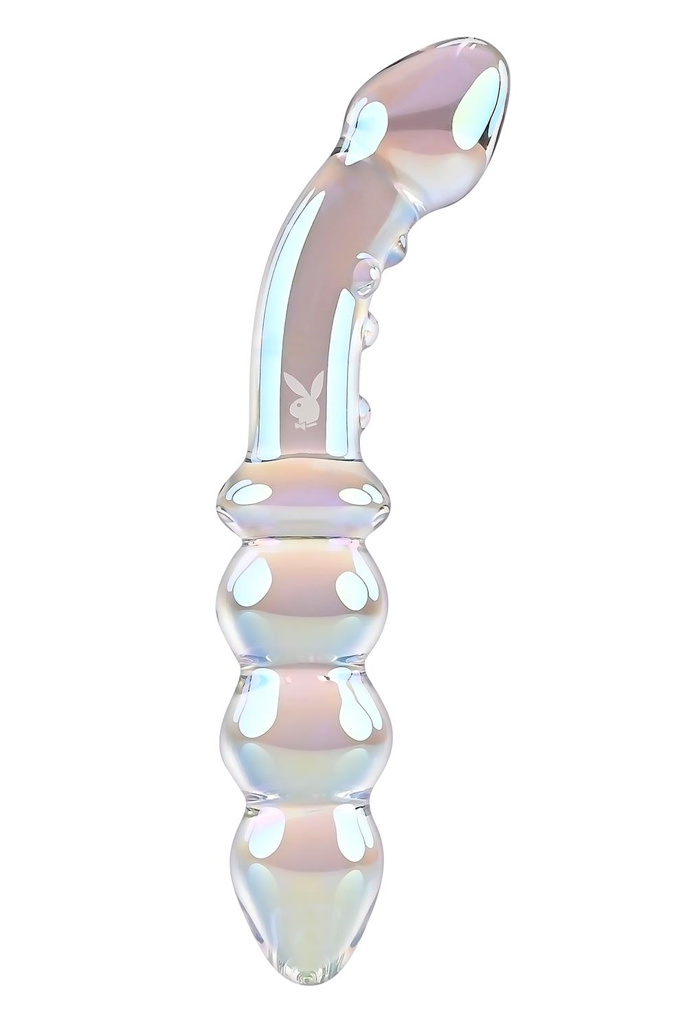 Introducing the Jewels collection, destined to be a favorite in your sex toy drawer. Jewels Double is a treasure trove of pleasure possibilities. One end features a curved and textured shaft with a tapered head for vibrant G-Spot and P-Spot stimulation. Flip the toy over and experience a row of chunky beads that are perfect for vaginal or anal play. Made of body-safe borosilicate glass, this Multi Play toy shimmers with a rainbow crystal iridescent finish and the iconic Rabbit Head Design adorns the shaft. Enjoy temperature play by immersing the toy in warm or cool water before use.