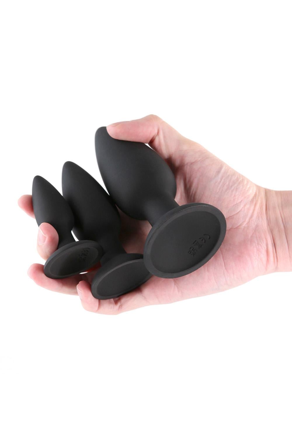 The Triple Strike Kit by Renegade includes three black plugs in graduated sizes with long necks and tapered tips for easy insertion – ideal for training solo or with a partner. Made of firm, pliable silicone. Suitable with all lubricants.
