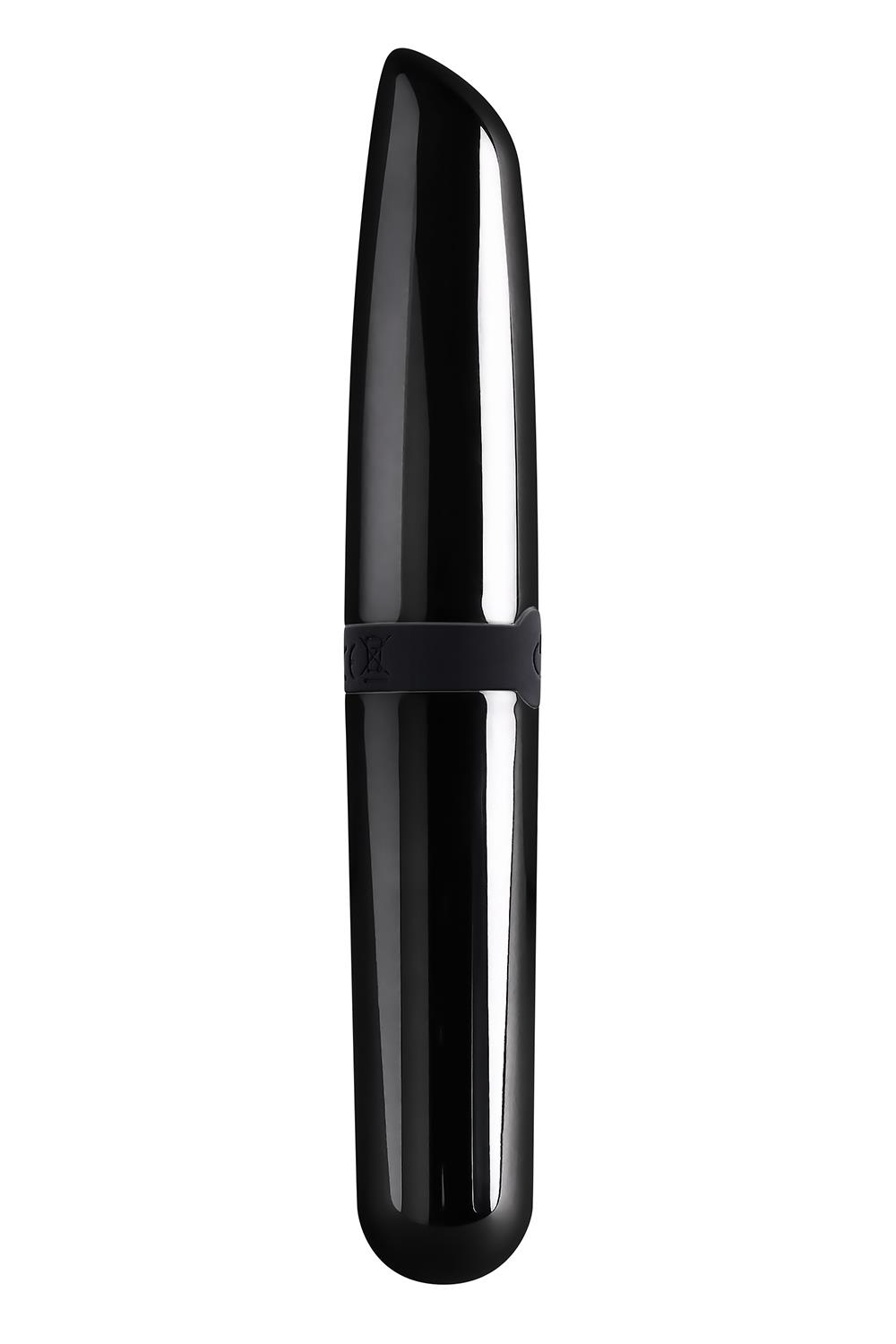 A powerful vibrating bullet with a sleek, black-chrome look. Double-ended with a lipstick shape on one side and rounded tip on the other.