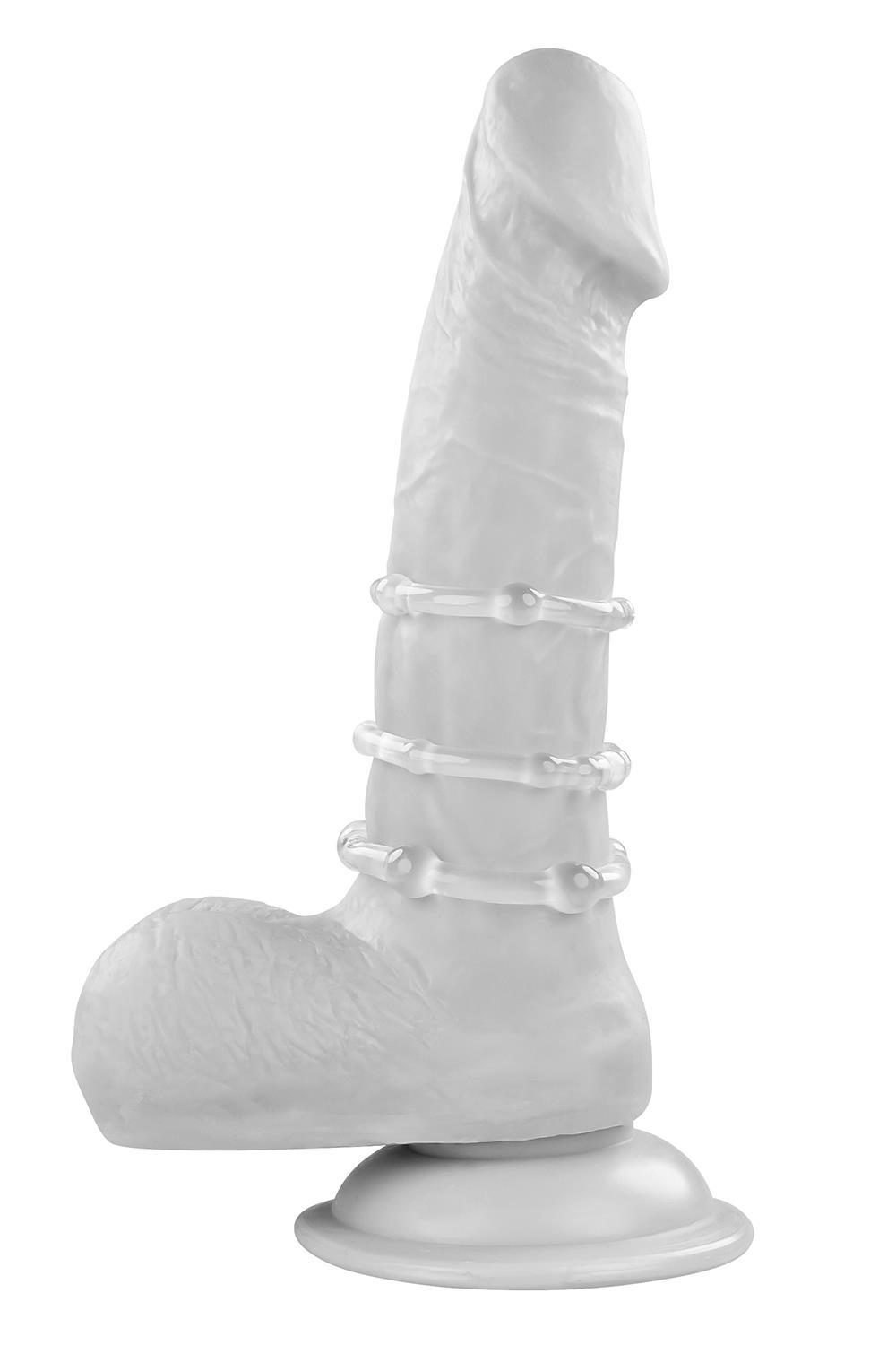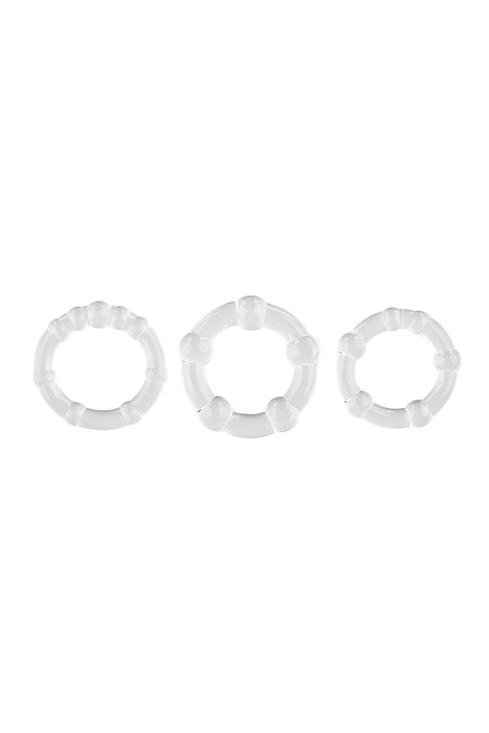 Strengthen your erection with this 3-ring collection that offers 3 levels of support – snug, tight & intense. Use one super-stretchy ring at a time or all 3 at once to enjoy a harder, girthier experience.
