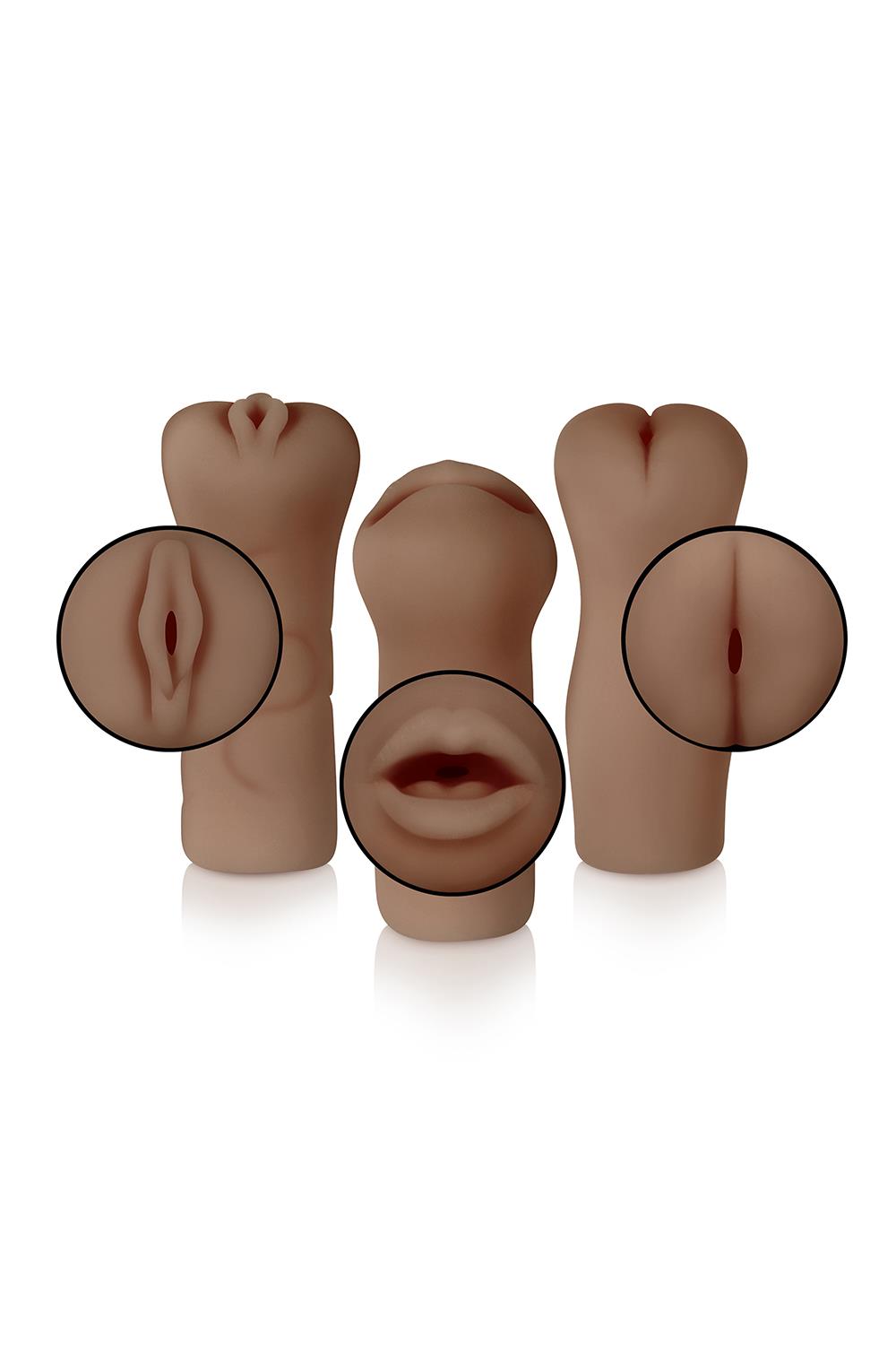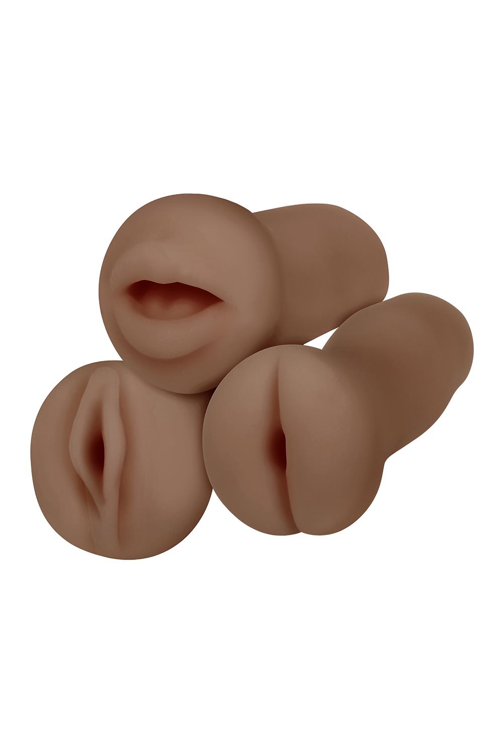 Fulfill your fantasies with these 3 life-like strokers designed to match your erotic mood. Each stroker features its own unique inner channel textures to mimic the pleasure of anal, vaginal and oral experiences. Use lubricant to enhance your stroking pleasure.