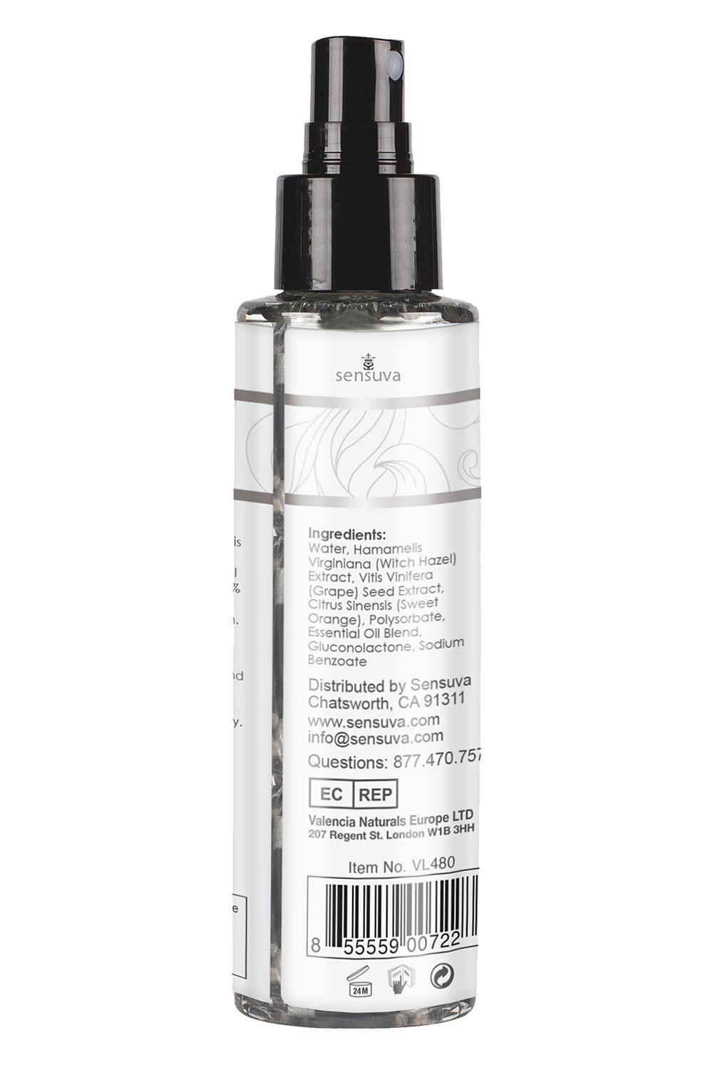 Water, Isopropyl Alcohol, Hamamelis Virginiana (Witch Hazel) Extract, Citrus Sinensis (Sweet Orange), Polysorbate, Gluconolactone, Sodium Benzoate, Fragrance