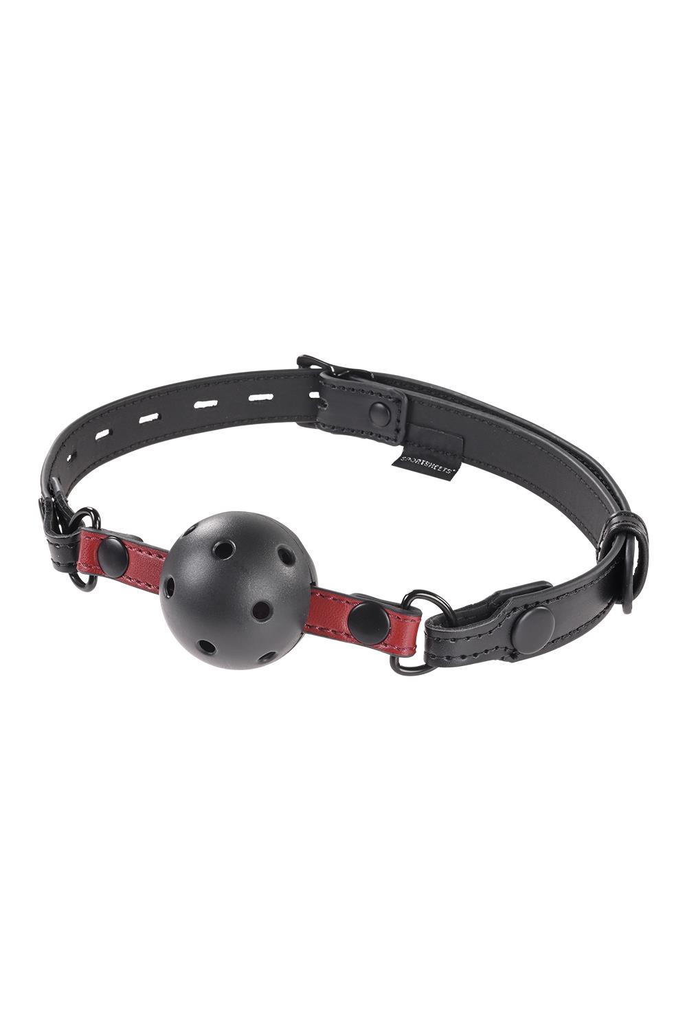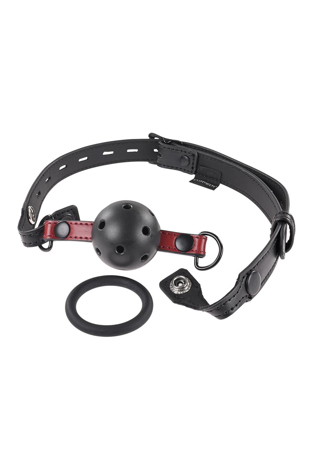 Add the “shhhh” to sultry with bright scarlet accents on a black satin finish. Luxurious faux leather and your choice of bite ring or breathable ball gag make the Saffron Interchangeable Gag a versatile must-have for any bondage collection. Simply unsnap each side of the gag to change out pieces for multiple ways to play.