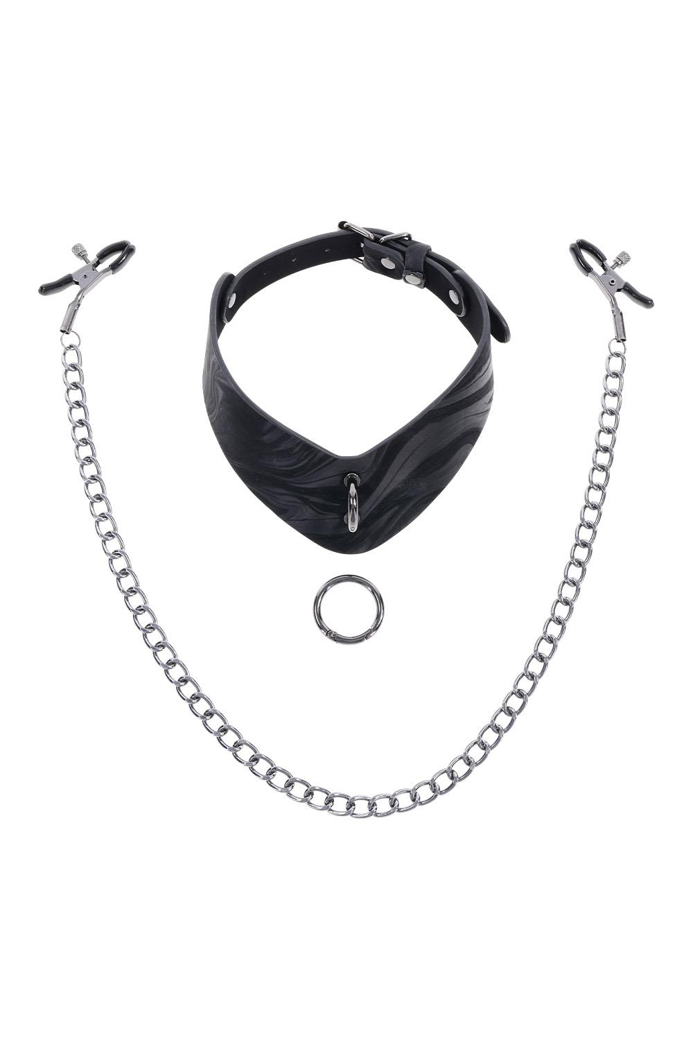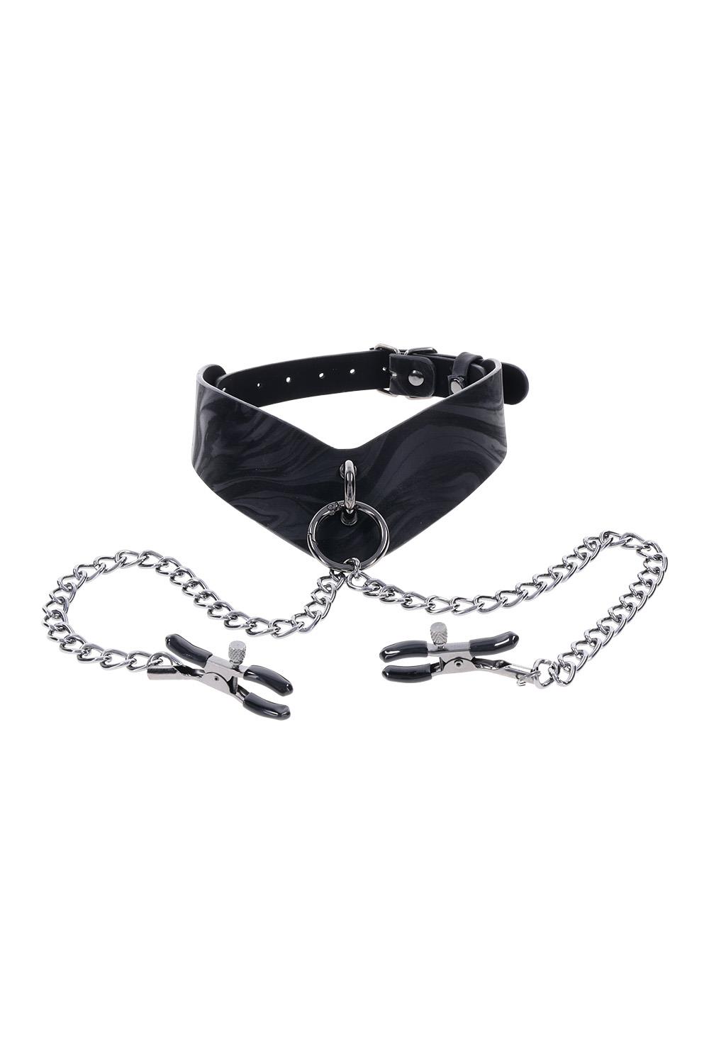 Elevate your scenes with the elegant dominance of the Velvet Noir Collar with Nipple Clamps. Crafted from smooth faux leather with a sleek marbled finish, this angled collar commands attention and control. Hematite-plated hardware, including a removable ring, offers both sophistication and functionality. A single metal chain connects to adjustable nipple clamps, adding a teasing element that can be removed for even more versatility. Use the collar with the clamps, swap in a leash, or wear it solo as a stylish day collar. Designed for both comfort and exploration, this piece invites you to play with power on your terms.
